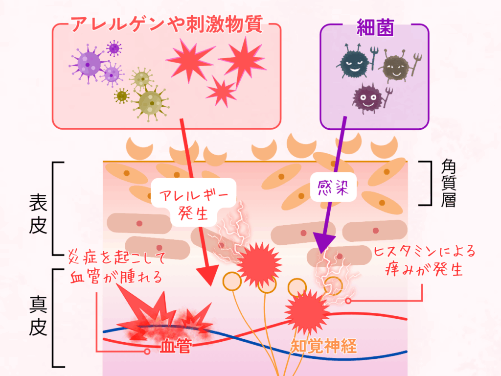 スティンギングは化粧品に含まれる特定の成分が角質層を通過し、知覚神経(の受容体)に触れることで発生します。