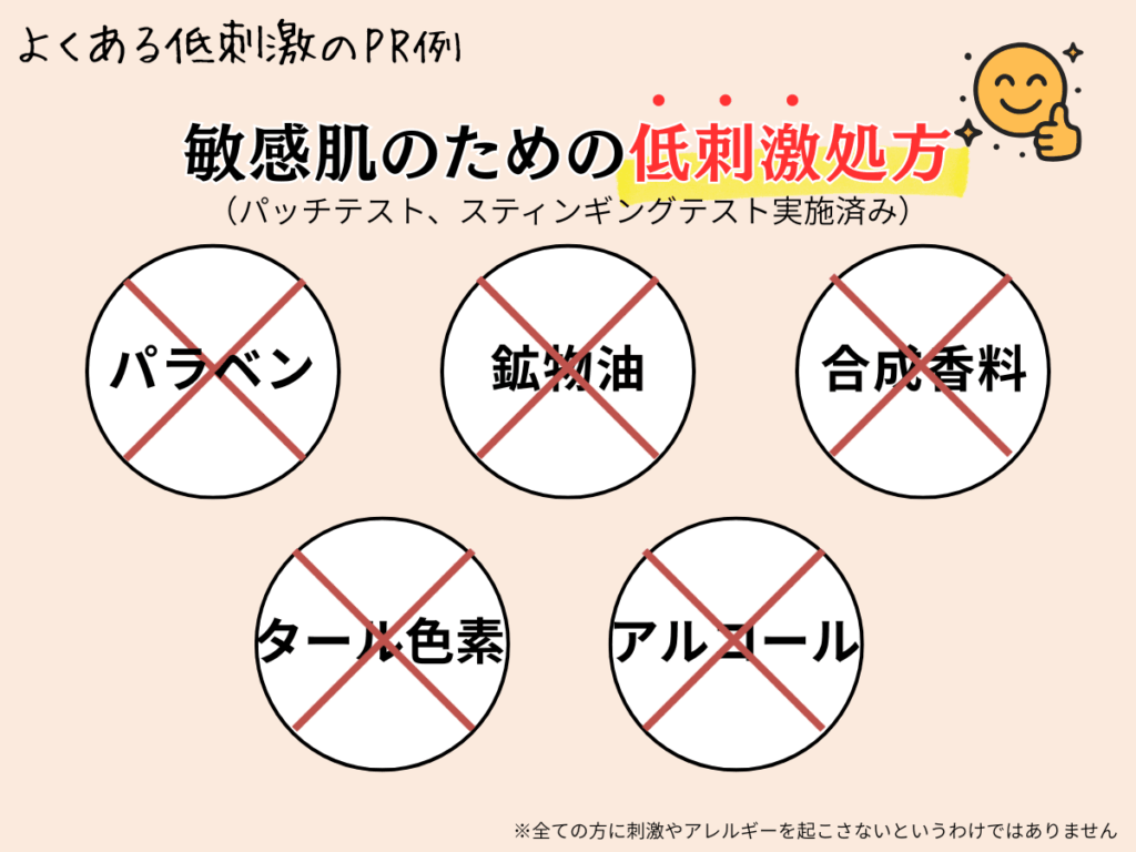 肌質や体調による個人差、そして季節的な肌の不安定さなど、あらゆる状況での刺激性を完全に保証するものではないことを覚えておいてください。
